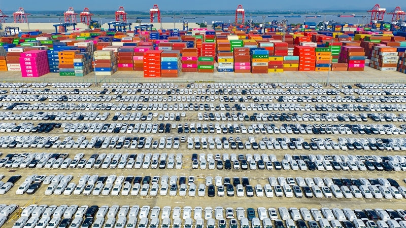 2025年10月4日在江苏省港口集团南京港龙潭港区拍摄的准备装船出口的汽车(无人机照片)。新华社发(杨素平?摄)