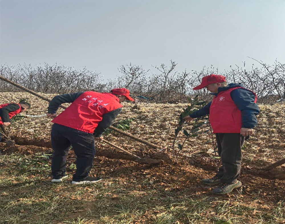 3月12日,阳光明媚,春意盎然,党员志愿服务队士气高昂,手拿铁锹、水桶、扫把等工具,热情高涨地投入到植树活动中。