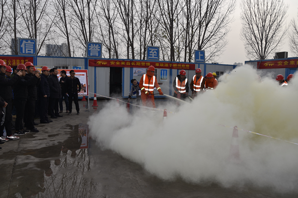 上午10点,演练活动正式开始。现场模拟了项目部工人宿舍因取暖设备漏电,引发火灾事故后,施工单位立即启动应急处置预案,通讯组、灭火组、疏散组、安全组分头行动,各负其责,为现场观众送上一幅幅井然有序的伤员救护、抢险灭火、善后安置等画面。最后,“伤员”被成功救出送医,火情完全得到控制。整个演练活动宣告完成。演练结束后,市消防协会工作人员还着重为大家讲解了火灾初期如何应对、灭火器的存放、使用注意事项等问题。现场观众体验了如何使用干粉式灭火器进行灭火。